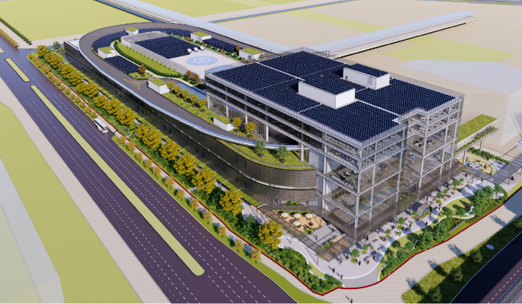 Since then, the HMGICS design has been developed to maximize the efficiency of the production space by concentrating work/R&D facilities and car parking on two towers.In addition, the design has been improved in: